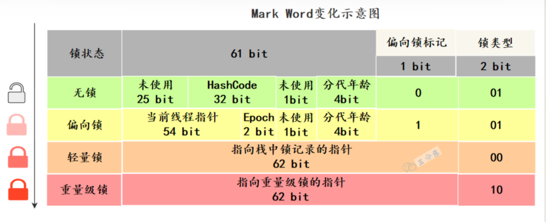 在HotSpot里,每个对象都有一个对象头,其中有一块区域叫Mark Word,里面会存储对象的一些运行时数据(如对象的哈希码、GC分代年龄、锁标志位(2bit)、是否偏向锁标志(1bit)、锁的指针)。JMV就靠着64bit来标记对象当前的锁状态。