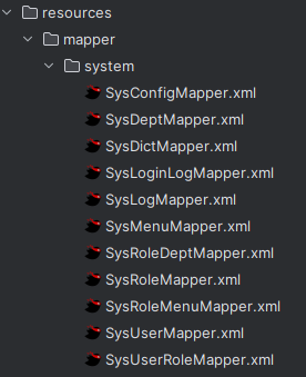 本来*Mapper.xml文件是生成在mapper/xml目录下的,在本例中是后移动到resources/mapper/system中,当然也可以不移动,配置文件中mapper-locations: classpath:mapper/**/*Mapper.xml可以找到。
