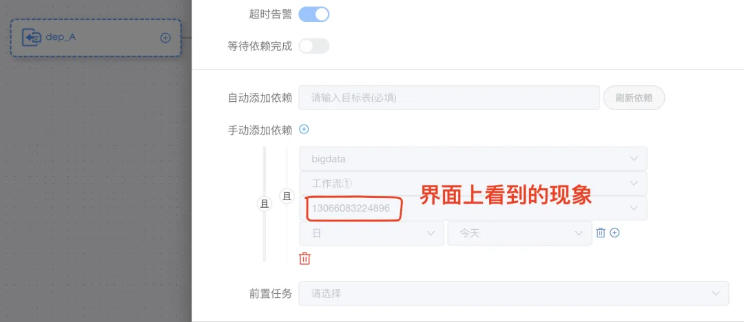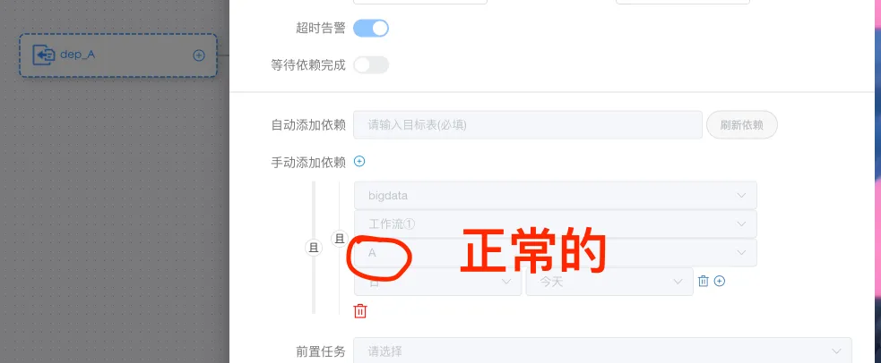 打开依赖节点dep_A,可以看到上游任务是 A,可以正常限时任务名字。