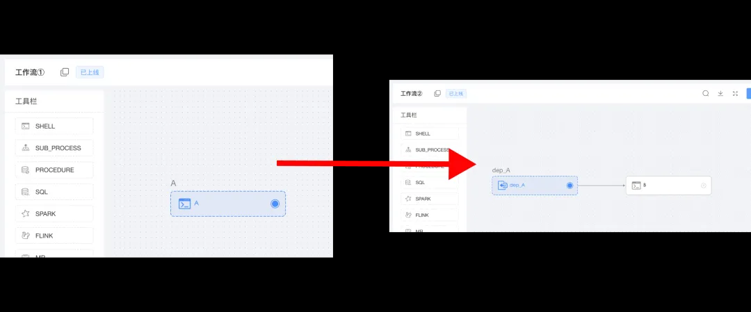 如图,工作流① 里面有任务 A,工作流② 里面有任务 dep_A 和 B。