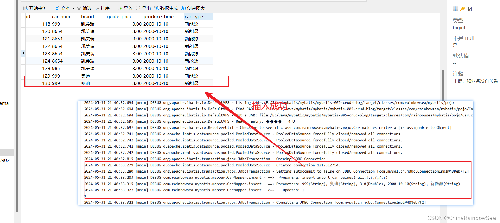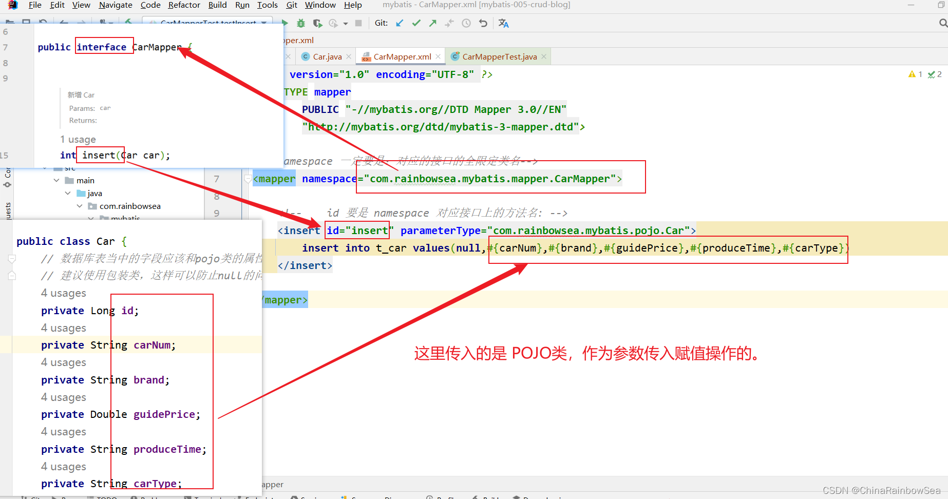<insert id="insert" parameterType="com.rainbowsea.mybatis.pojo.Car">