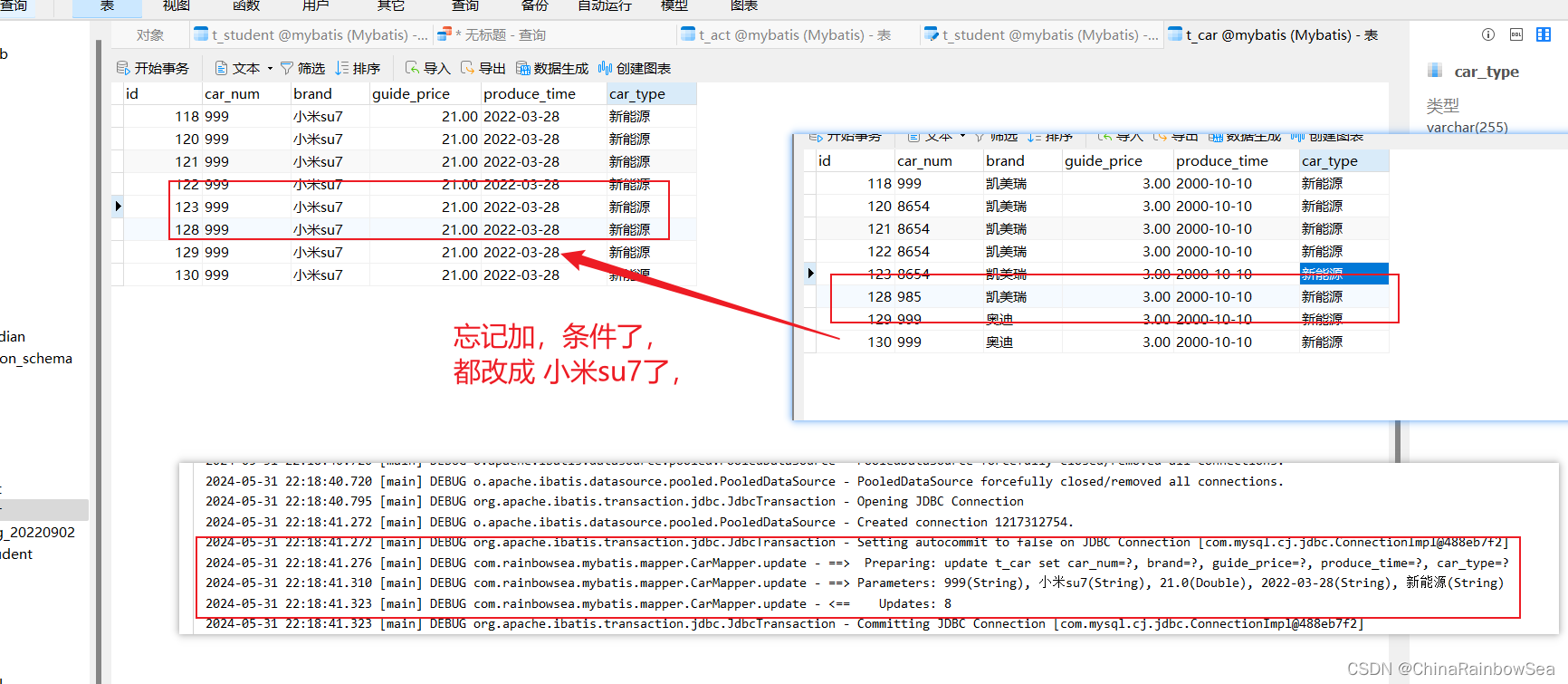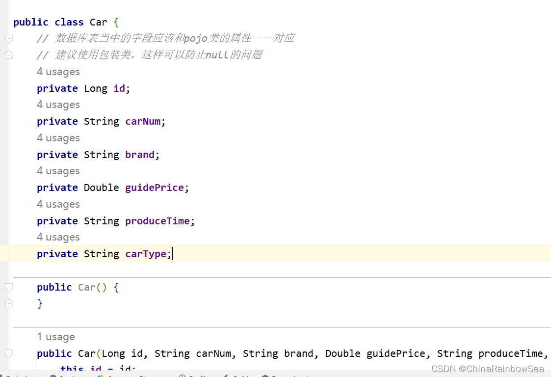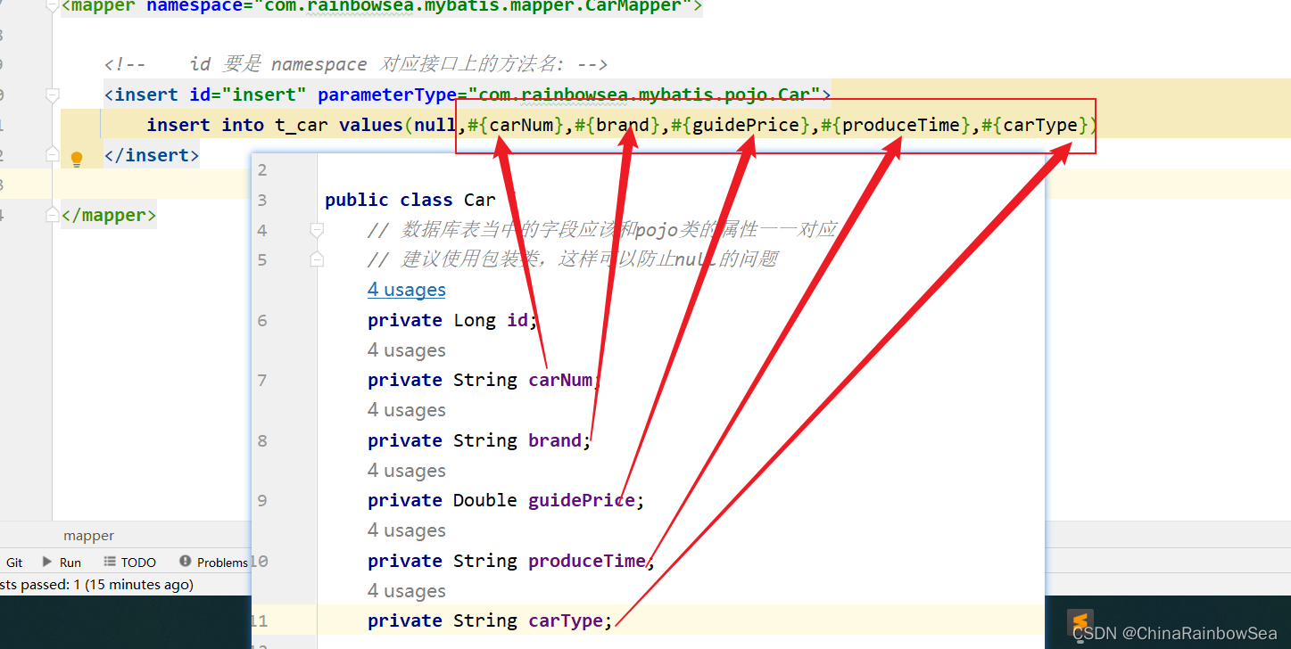 - 使用的是 POJO 属性类赋值的话,#{} 的括号中的值,必须是 POJO类当中的属性名,比如这里我们用的是 Car ,则#{}括号中的值,则必须是 Car 的属性名。同时 #{} 括号中一定要有值(就算只有一个参数,也要有值(随便写都要有值),才行,不然编译无法通过)