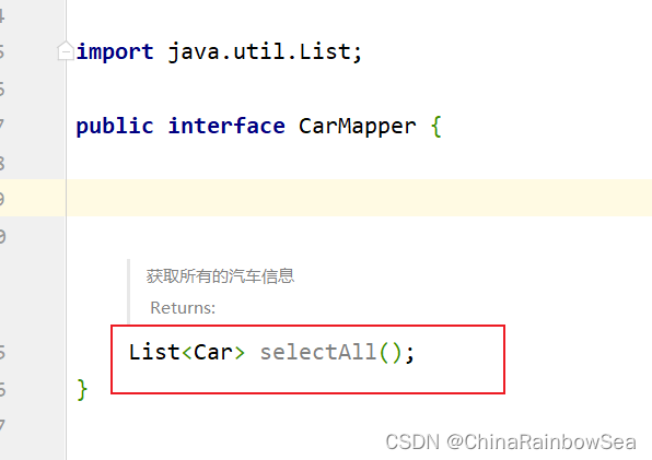 <select id="selectAll" resultType="com.rainbowsea.mybatis.pojo.Car">