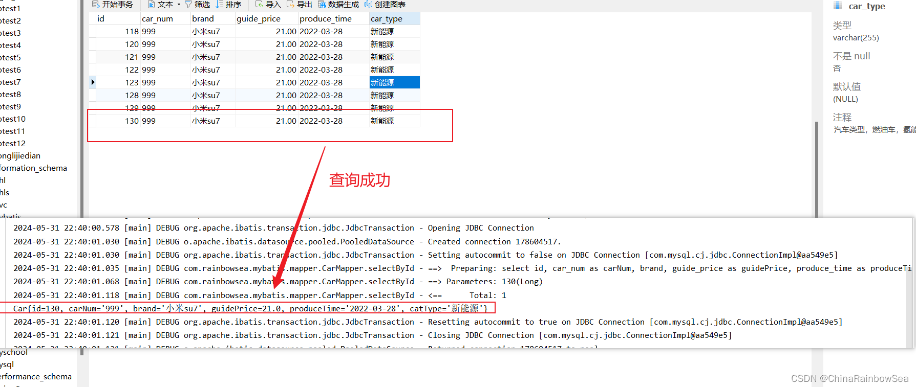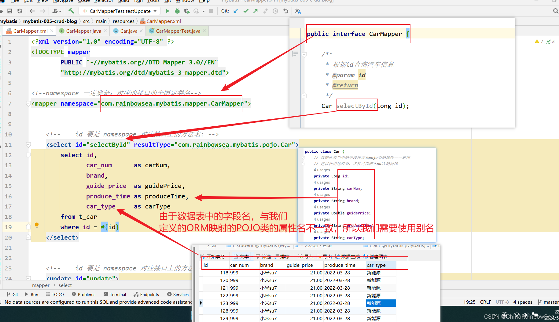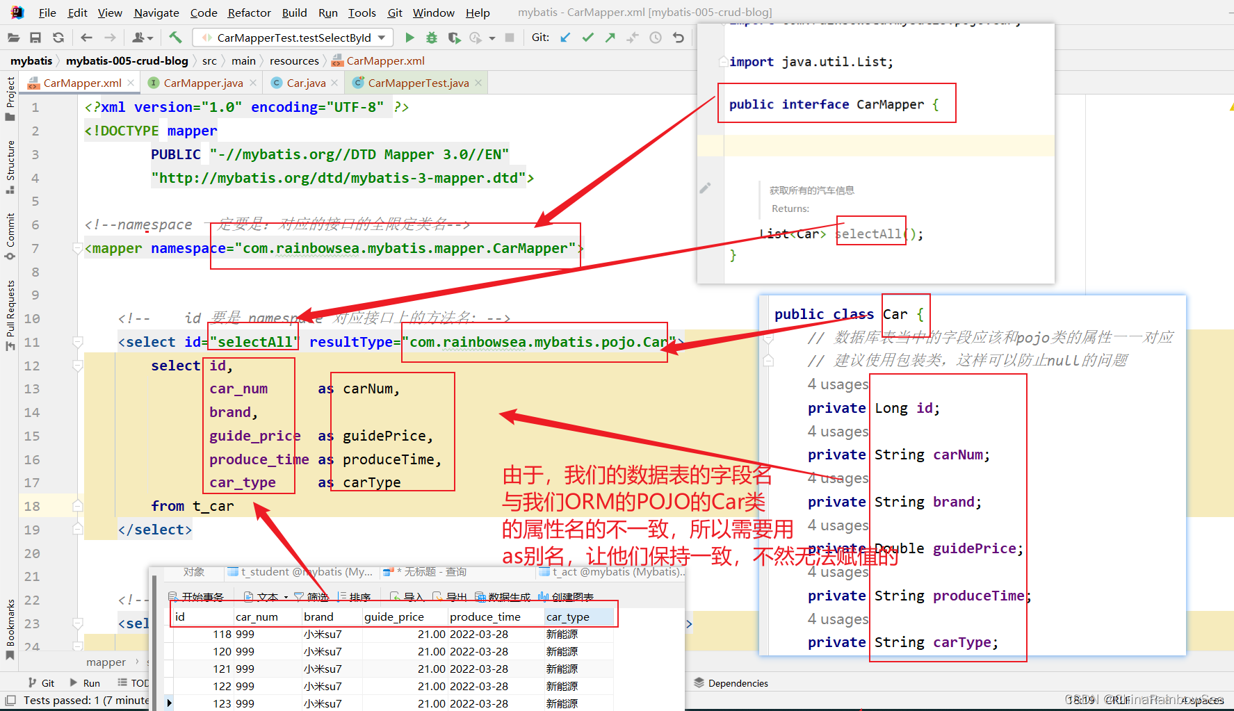 同时由于我们的数据表的字段的命名方式是下划线 ,部分数据表的字段名与我们设置的 ORM 映射的POJO类的属性名不一致,需要将他们二者的名字保持一致,所以我们需要使用 AS 定义别名,不然无法将对应数据表中的值,赋值到 对应的 POJO的类当中(这里是 Car 类当中)