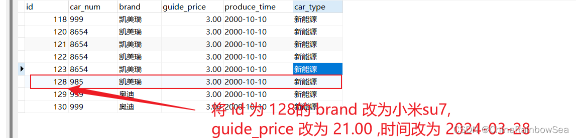 将 id 为 128的 brand 改为小米su7, guide_price 改为 21.00 , 时间改为 2024-03-28
