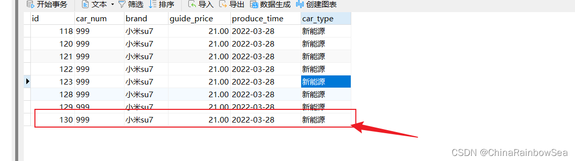 Car car = new Car(128L, "999", "小米su7", 21.0, "2022-03-28", "新能源");