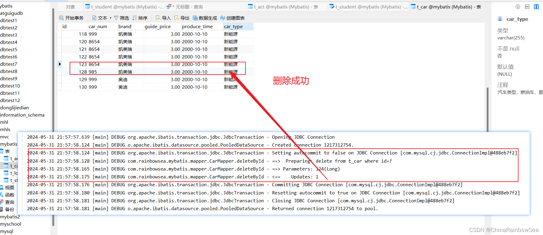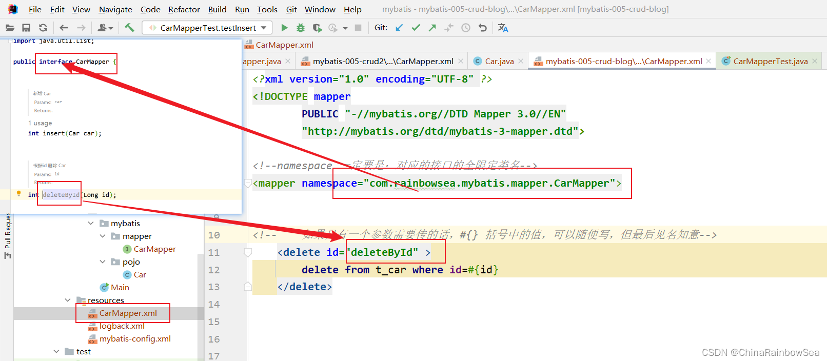 对应 CarMapper.xml SQL语句映射文件,上编写 delete 删除的 SQL语句。