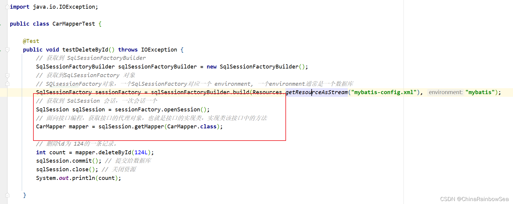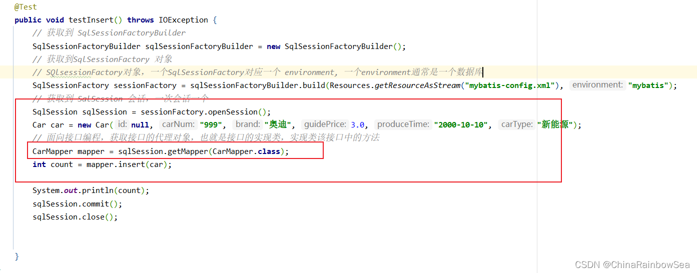 // 获取到 SalSession 会话,一次会话一个 SqlSession sqlSession = sessionFactory.openSession(); Car car = new Car(null, "999", "奥迪", 3.0, "2000-10-10", "新能源"); // 面向接口编程,获取接口的代理对象,也就是接口的实现类,实现类该接口中的方法 // 需要注意的是参数的 Xxxmapper.class 和 返回值是保持一致的。 XxxMapper mapper = sqlSession.getMapper(XxxMapper.class); mapper.xxx(); // 执行的是该XxxMapper接口中的方法