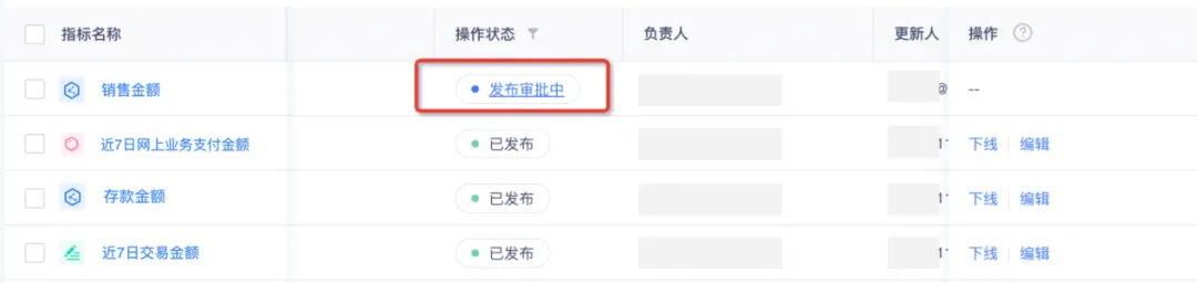 指标进行创建或编辑后,会进入审批状态,此时新的指标口径还不能正式被使用,用户可在指标列表中查看指标发布进展。