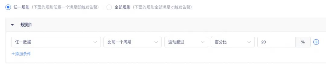 基线比较指的是把当前数据和历史数据进行比较,例如环比(和上一期进行比较)或者同比(与去年同期进行比较)。「袋鼠云指标管理平台」目前支持和上一周期进行比较,针对波动幅度过大的指标,能够向特定业务人员发出告警,以便其进行业务波动的筛查。