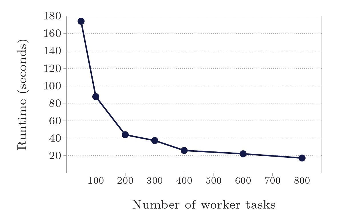- 点/边规模10亿:worker数50-800,计算时间174s-17.3s,16x worker加速10x。