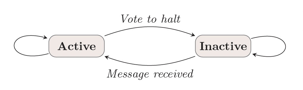 Pregel计算模型运行一系列超步直到计算结束,超步之间通过全部同步点(Barrier)进行分割。每个超步中点上的计算都是并行的,当所有的点都是inactive状态且没有消息传递时,计算终止。