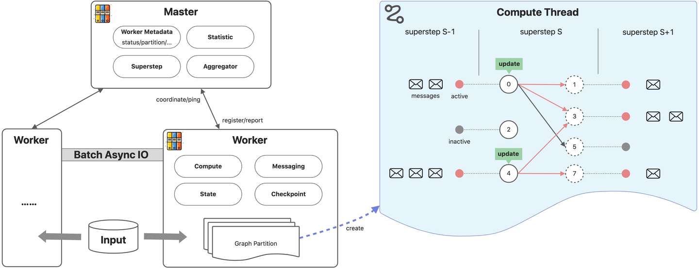 - master决定图的分区,默认hash(点ID)%分区数。worker负责维护图分区的状态、执行compute函数、收发其他worker的消息。