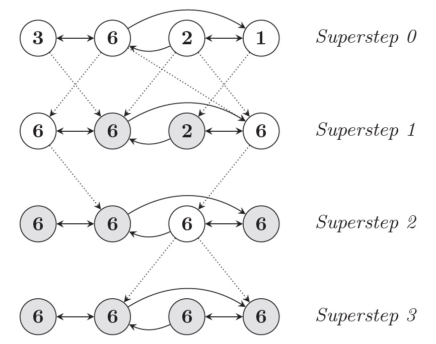 - 计算是由一系列的迭代组成,这些迭代被称为超步(Superstep)。