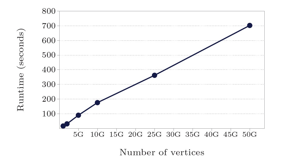 - worker数800:点/边规模10亿-500亿,计算时间17.3s-702s,计算时间线性增长。