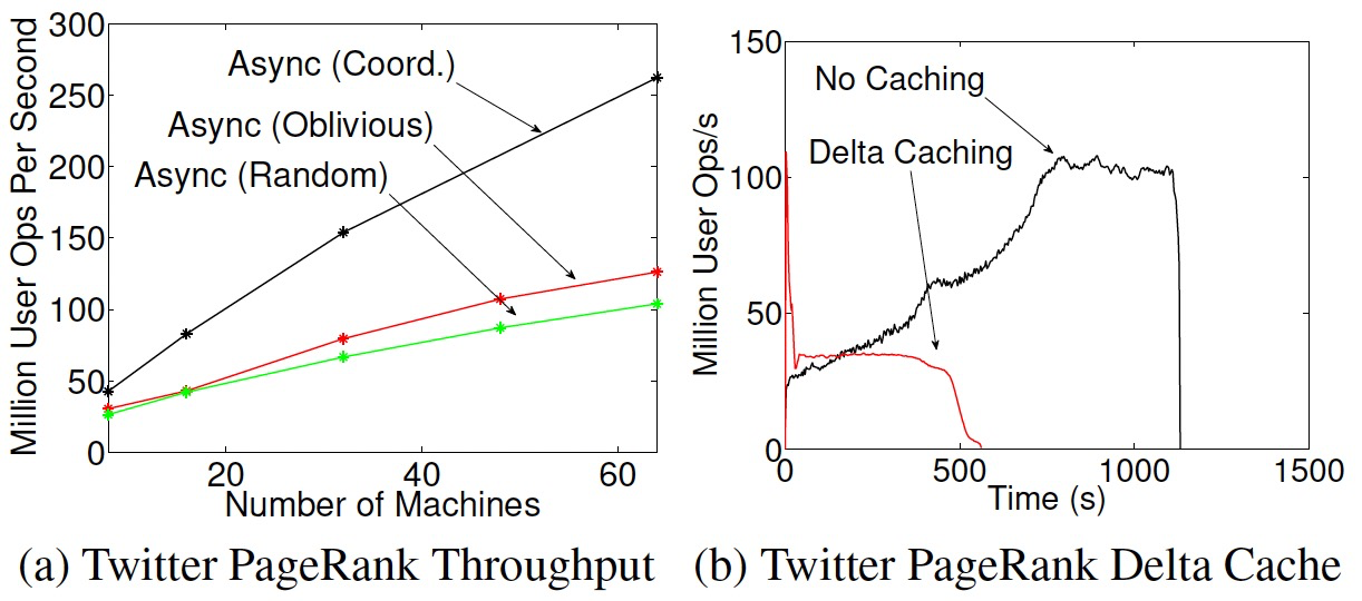- 使用Delta Caching可以让算法快速收敛,关闭Delta Caching吞吐会持续上升(计算聚焦到高度点时增加了计算通信比)。