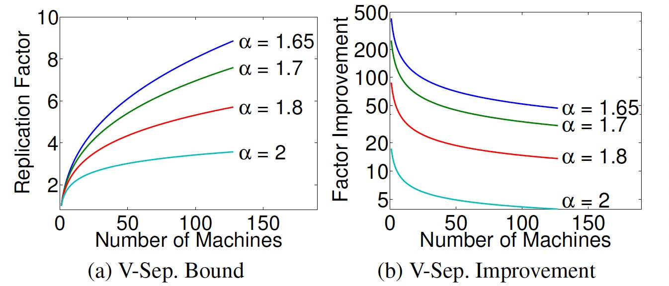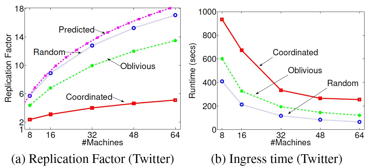 - Twitter数据集上,随着机器增多复制因子也会增加,Coordinated增长最慢,其次Oblivious,最后Random。论文提出的复制因子模型和Random算法非常接近。