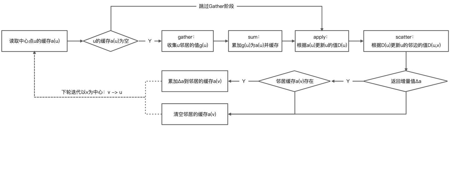 GAS点程序一般会被少量的邻居更新触发,但是每次都会gather所有邻居的数据,造成计算资源浪费,因此通过维护点的sum值缓存\(a_u\),以实现跳过下次迭代的gather阶段。