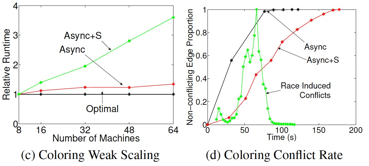 - 图着色问题,异步引擎可以快速的满足着色条件,但最后1%的边占用了34%的时间(长尾,高度点竞争),异步串行化相对更均匀。另外,异步引擎的多执行了2倍的操作。