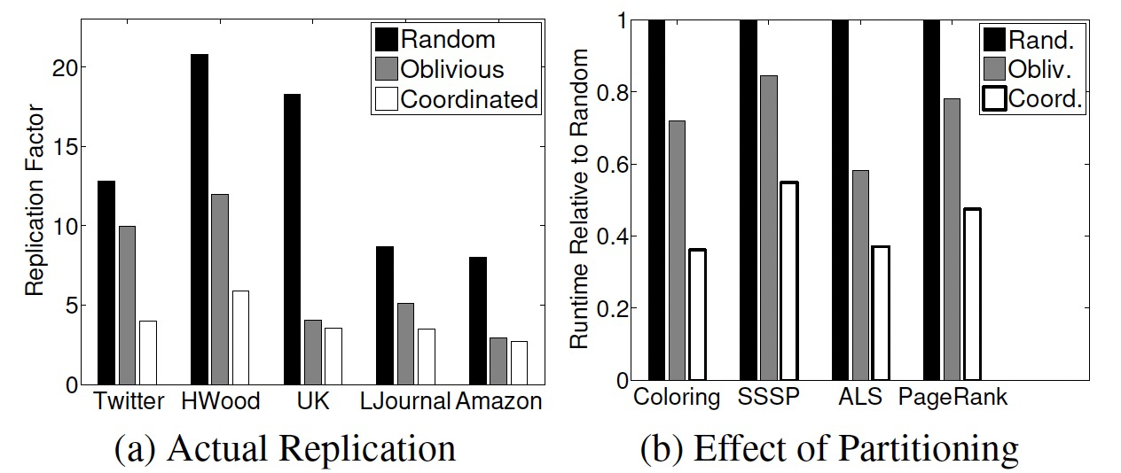 - 在不同的数据集上,Coordinated复制因子最低,其次Oblivious,最后Random。