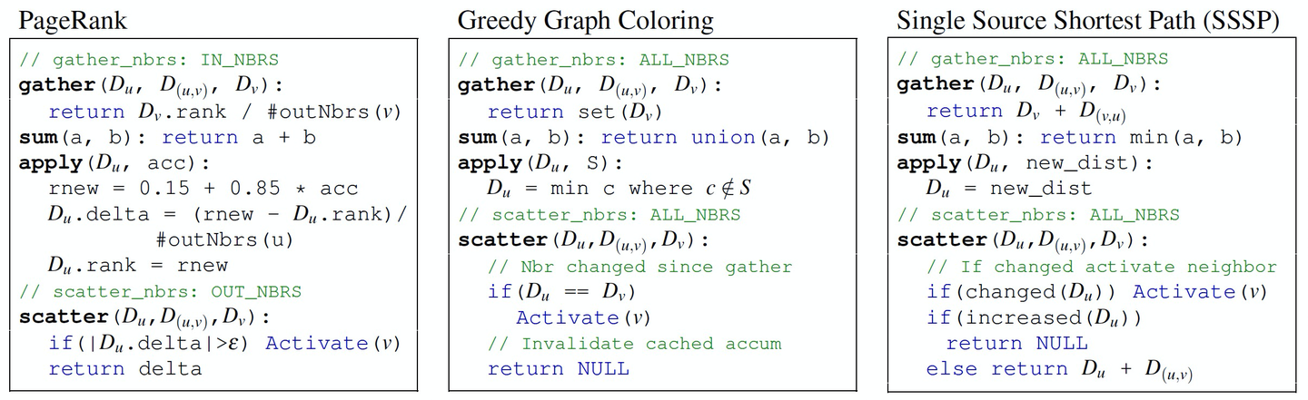 - Scatter节点:将新的点值更新邻边值:\(\forall v \in \mathbf{Nbr}[u]:(D_{(u,v)}) \leftarrow s(D_u^{new}, D_{(u,v)}, D_v)\)
