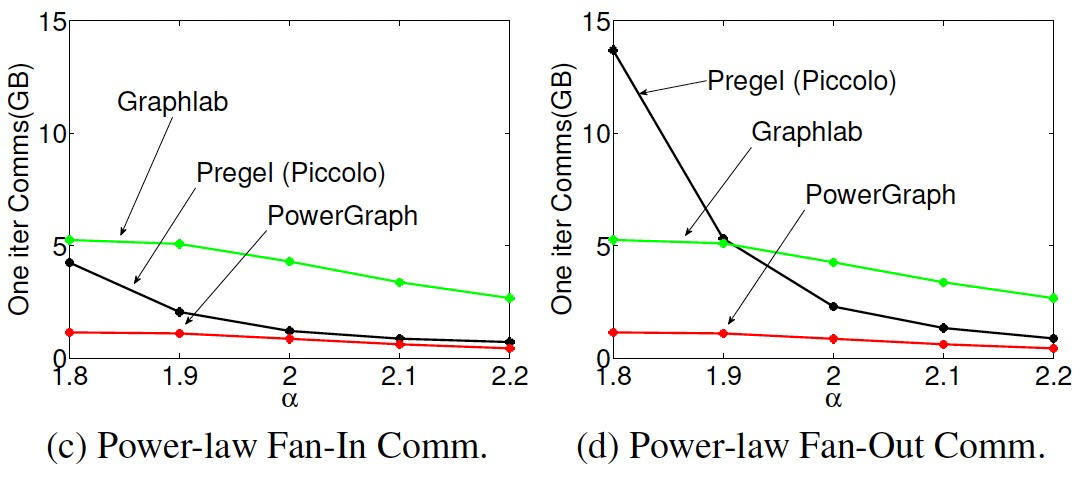 - Pregel需要往出边发消息,因此在扇出图上通信量很高。