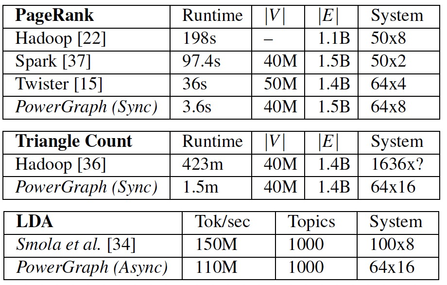 - GraphLab(v1)、Pregel(Piccolo,Giraph内存不足)、PowerGraph。