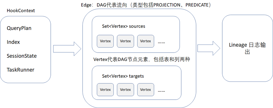 Hive 是典型的数据仓库的代表,也是大数据中离线数据分层模型设计的代表,并且支持HQL的数据处理和计算,所以Hive为了方便用户做数据跟踪,在底层设计时,其实就考虑到了数据血缘跟踪这个问题。Hive 自身的血缘在其源码中主要通过org.apache.hadoop.hive.ql.hooks.LineageLogger.java 来输出,org.apache.hadoop.hive.ql.hooks.LineageLogger.java代码中主要处理的过程如下图所示,血缘主要通过edges(DAG图的流向)和vertices(DAG图的节点)来进行输出。《数据资产管理核心技术与应用》读书笔记