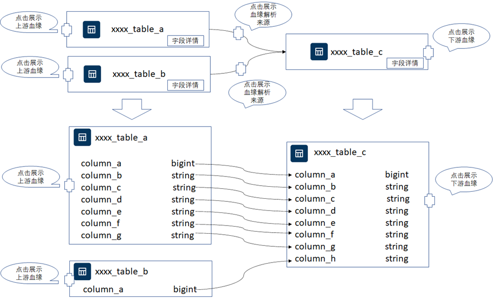 - 详情中支持字段级血缘展示,点击图中表的字段详情时,可以继续展开显示字段级的血缘关系。