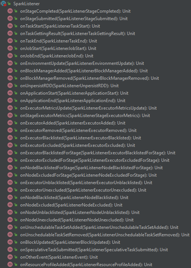 有了通过SQL语句来解析血缘的思路后,需要解决的问题就是怎么自动抓取到Spark中运行的SQL语句。在上面的叙述中,有提到过Spark 有Listener的机制,org.apache.spark.sql.util.QueryExecutionListener只是Listener中的一种,可以通过Listener的方式自动获取到Spark的相关执行信息。在Spark中提供了org.apache.spark.scheduler.SparkListener这个底层抽象类来供上层代码监听Spark在整个生命执行周期中的相关事件消息,如下图所示。