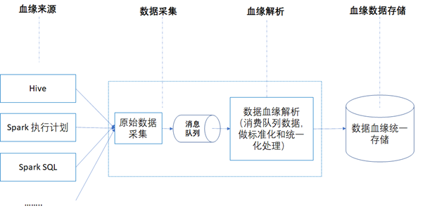 数据血缘的采集和处理的过程通常如下图所示,实时获取原始数据,然后发送到类似Kafka这样的消息队列中,然后对原始数据进行解析,生成血缘数据,然后入库保存。