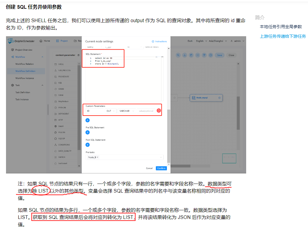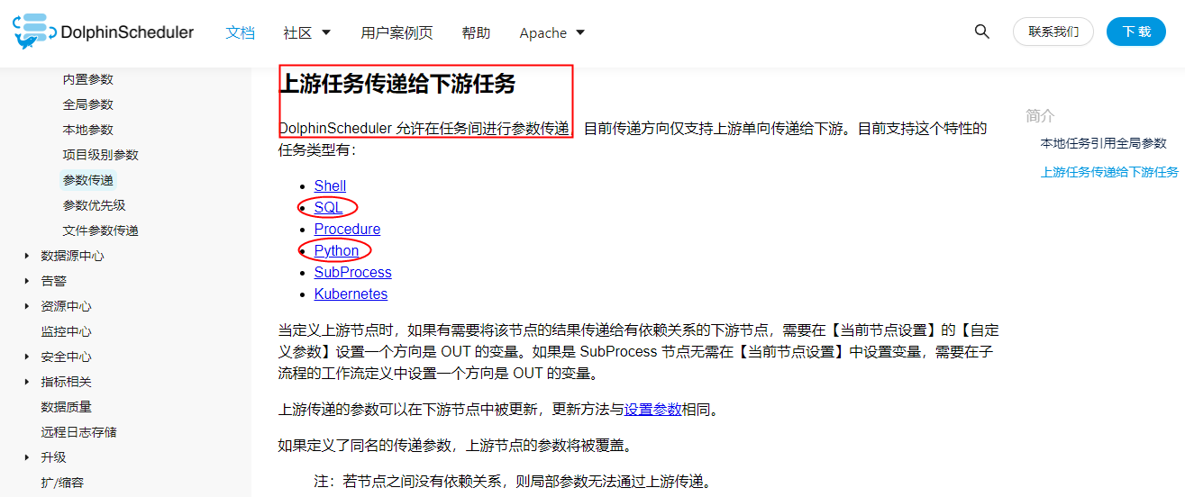 例如SQL组件的列表数据无法传输到下一个组件的问题。官方文档显示Apache DolphinScheduler支持SQL和Python参数传递,但在实际应用中,我们发现LIST数据类型是不可传递的。为了解决这个问题,团队只能使用http的方式开发接口,把源数据同步到数据管理平台。