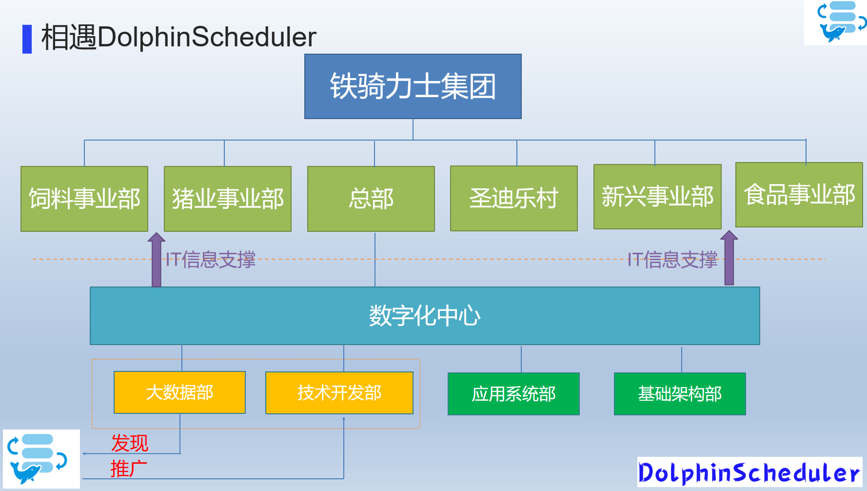 在铁骑力士集团的数字化转型过程中,近万人的集团业务,30多套业务系统需要依靠数字化中心的技术人员作为IT信息支撑,我所在的技术开发部门感到压力巨大。Apache DolphinScheduler的引入是一个关键的里程碑,它不仅支持了集团在饲料事业部、生猪事业部等多个部门,还促进了数字化中心与大数据部的协同工作。