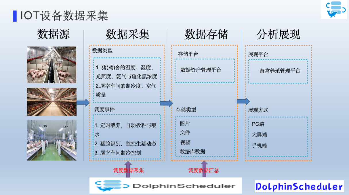 在IOT设备数据采集方面,铁骑力士集团期望利用Apache DolphinScheduler实现了对猪(鸡)舍和屠宰车间环境的实时监控与数据采集,包括温度、湿度、光照度、制冷度、氨气与硫化氢浓度等关键指标,上传到数据资产管理平台,经过对数据的调度,最终在禽畜养殖管理平台展现出来。