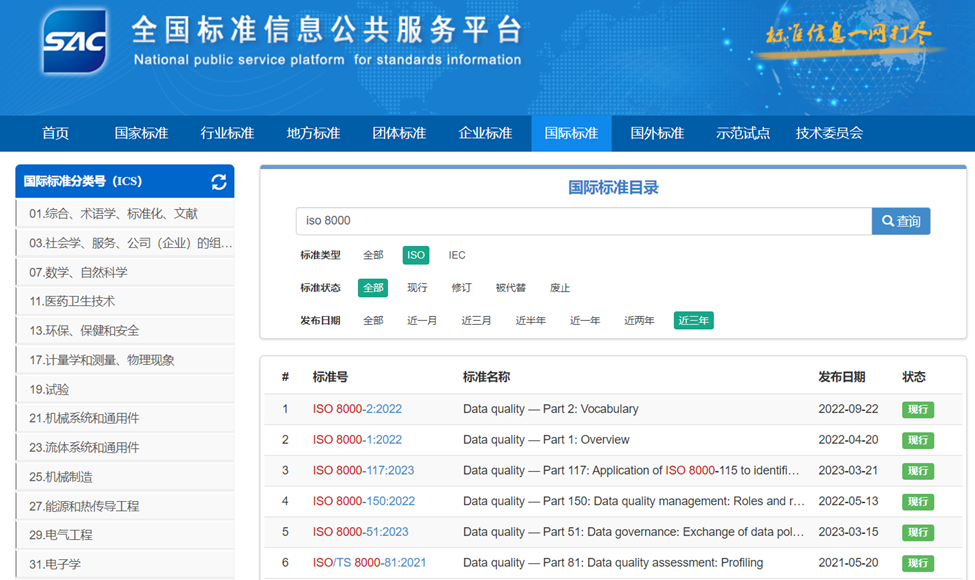 正是因为数据质量的重要性,所以在国际上有专门对数据质量进行国际标准定义,比如ISO 8000数据质量系列国际标准中就详细的描述了数据质量如何衡量以及如何进行认证等,包含了数据质量的特性、特征以及如何进行数据质量的管理、评估等。在ISO 8000中共发布了21个标准,在网址:https://std.samr.gov.cn/gj/std?op=ISO中可以查询到ISO 8000质量标准,如下4-0-2所示