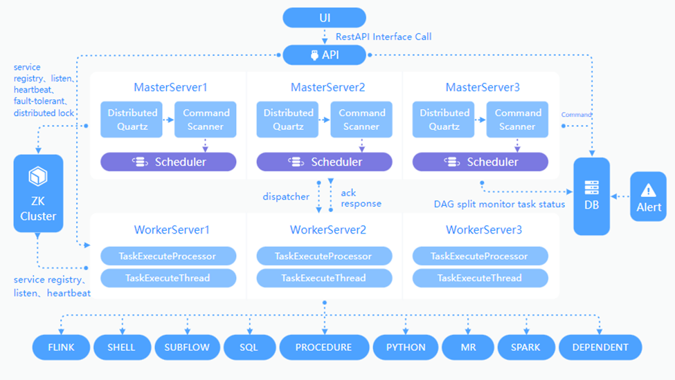 如下图所示,为官方在网址https://dolphinscheduler.apache.org/en-us/docs/3.2.0/architecture/design中提供的技术实现架构图。