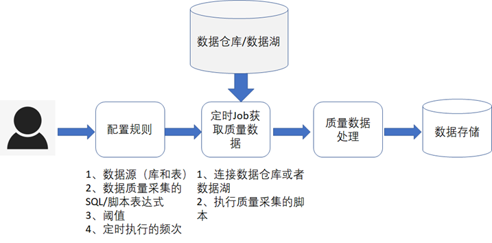 不管是在数据仓库还是数据湖中,一开始我们都是不知道数据的质量情况的,需要通过一定的规则定期的到数据湖或者数据仓库中去采集数据的质量,这个规则是允许用户自己去进行配置的,通常的流程如下图所示。