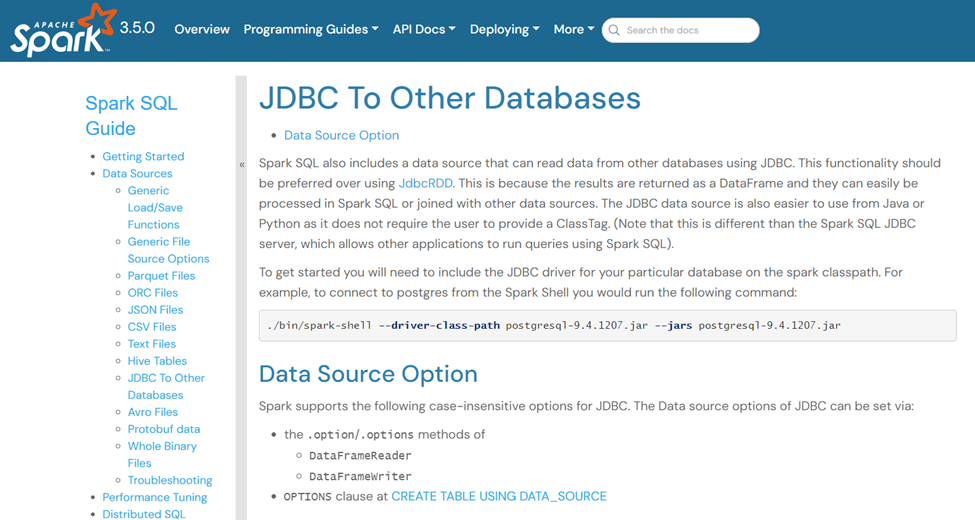 总结下来就是:如果数据库或者数据仓库本身支持JDBC 协议,那么可以直接通过JDBC协议运行SQL语句。如果不支持的话,那么可以通过SparkSQL job的方式进行过渡,SparkSQL 本身支持连接到Hive、Hudi等数据仓库或者数据湖,也支持通过JDBC的方式连接到其他的数据库。在官方网站地址: https://spark.apache.org/docs/latest/sql-data-sources-jdbc.html中有明确的介绍,如下图所示。
