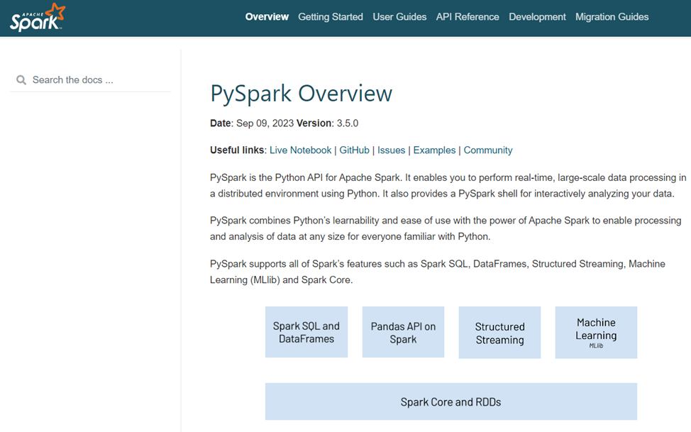PySpark的相关介绍可以参考网址:https://spark.apache.org/docs/latest/api/python/index.html,如下图所示。