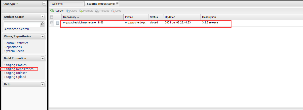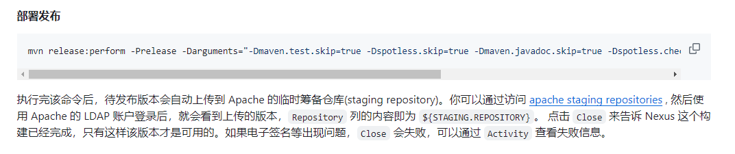 该命令基于发版准备的结果,所以【发版准备】的结果不能做任何修改(包括代码),命令结束后会在https://repository.apache.org/#stagingRepositories 中显示内容。这个内容可能会有一点点延迟,但正常不会超过五分钟。如果发现没有文件,大概率是maven的远程仓库配置问题,可以排查一下。