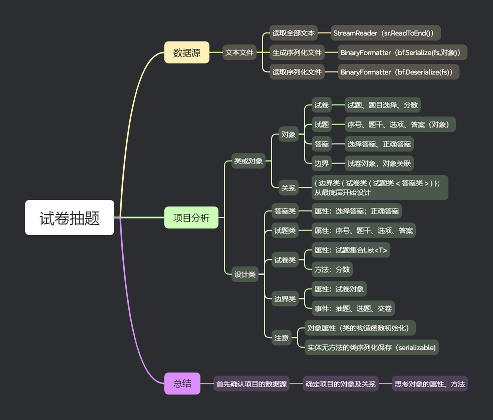 开发一个项目之前,切记不要打开程序就写代码,首先要做的就是分析项目,从项目的架构开始思考,软件要实现什么功能(思考UI界面布局);数据从哪里获取?(数据库、文本文件、通讯接口…);重点思考项目对象、功能有哪些?(对象的属性<成员>、方法<功能>,之间的关系…),以此项目为例,思维导图如下: