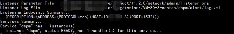 Listener Parameter File /db/oracle/product/11.2.0/network/admin/listener.ora Listener Log File /db/oracle/diag/tnslsnr/VM-80-3-centos/dspm/alert/log.xml Listening Endpoints Summary... (DESCRIPTION=(ADDRESS=(PROTOCOL=tcp) (HOST=10.1.1.3) (PORT=1532))) he listener supports no services he commandcompleted successfully