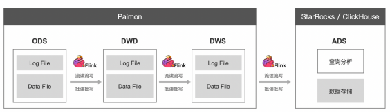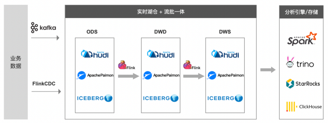 · 将 DWS 层数据加工后打入 StarRocks 或者 ClickHouse 这类存储+分析的统一引擎。该方案可以充分利用这类引擎的查询加速能力,对于 OLAP 场景有较高要求的企业,是个比较合适的方案。