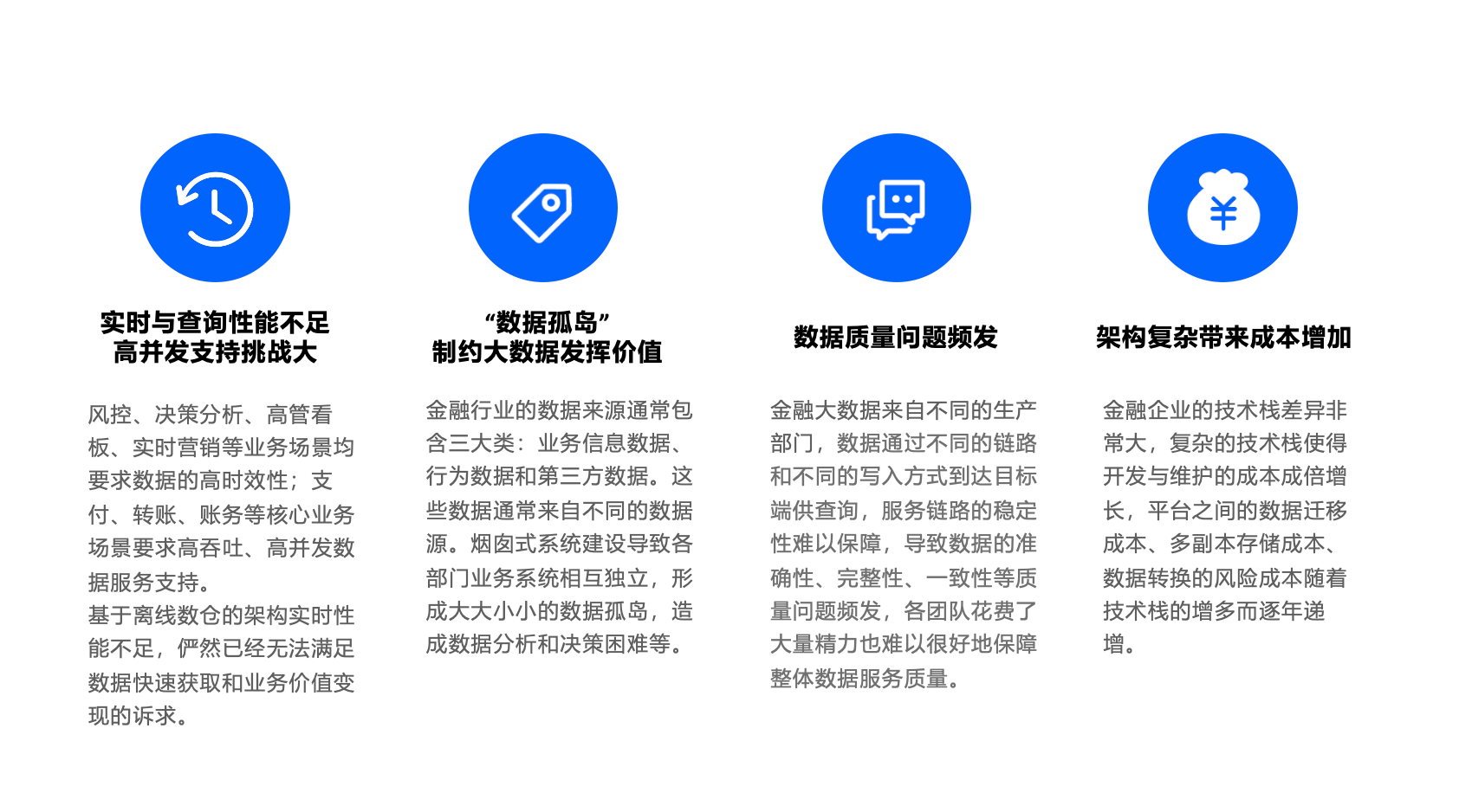 - 实时与查询性能不足,高并发支持挑战大: 金融行业中常见的风控、决策分析、高管看板、实时营销等业务场景均要求数据的高时效性以及秒级甚至毫秒级的查询性能;同时金融行业常见的支付、转账、账务业务场景均对吞吐量有很高的要求,需要稳定的高并发数据服务支持。然而基于离线数仓的架构实时性能不足,俨然已经无法满足数据快速获取和业务价值变现的诉求。