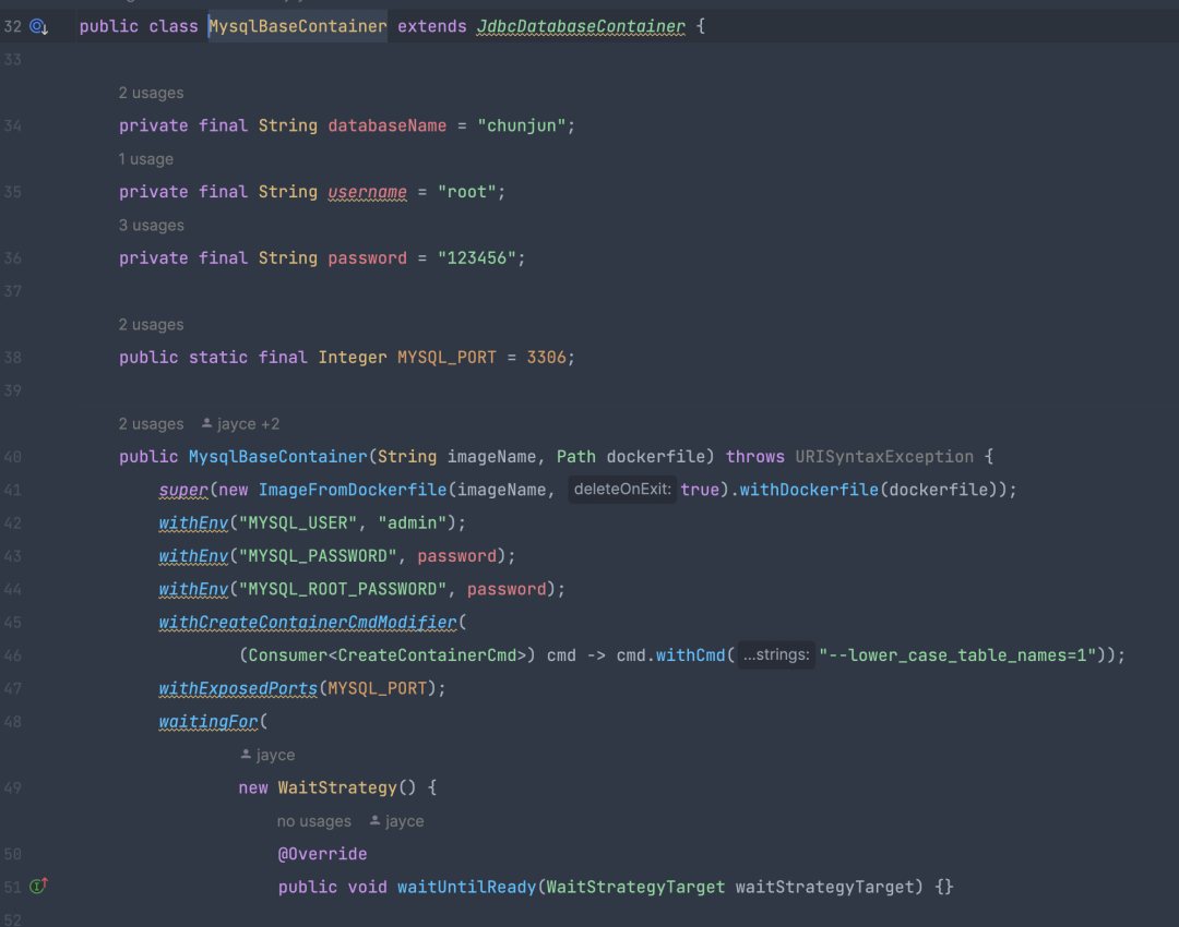 基于 TestContainer 进行扩展也是很简单的,只需要继承 GenericContainer 类,传递 DockerFile 文件路径即可,TestContainer 对于 JDBC 类型数据源提供了 JdbcDatabaseContainer 抽象类。