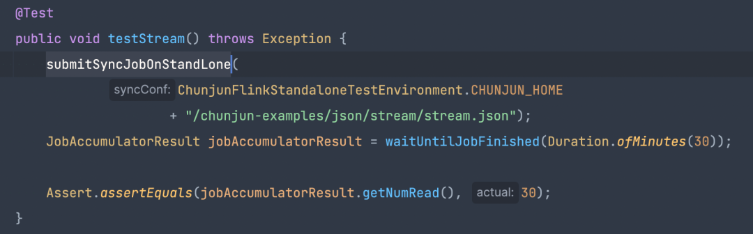 test 方法里只需要 submitSyncJobOnStandLone 提交 json 脚本到 Flink 的 stabdlone 集群里,通过 waitUntilJobFinished 获取任务结果并进行判断。