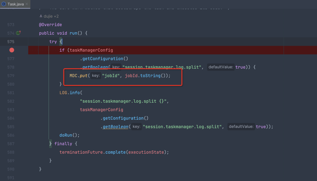 之后,我们需要在Flink 源码中的org.apache.flink.runtime.taskmanager.Task#run里加上 MDC.put(“jobId”, jobId.toString()); 即可。