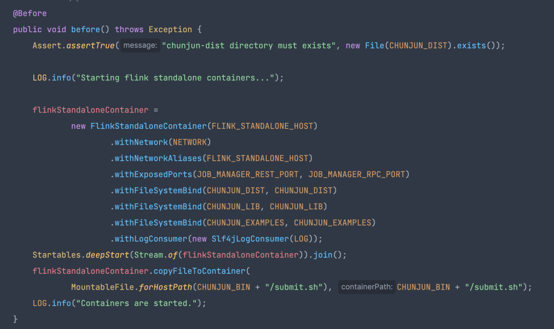 ChunJun-e2e 模块整合了 ChunJun-client 模块,主要是借助 TestContainer 在 Docker 环境中启动 Flink 的 standlone 环境以及各个数据源。因此只需要编写需要测试的 json 文件之后,通过 ChunJun-client 模块快速提交任务到 standalone 集群中进行任务的运行,并根据任务运行结果等信息来判断任务是否通过。