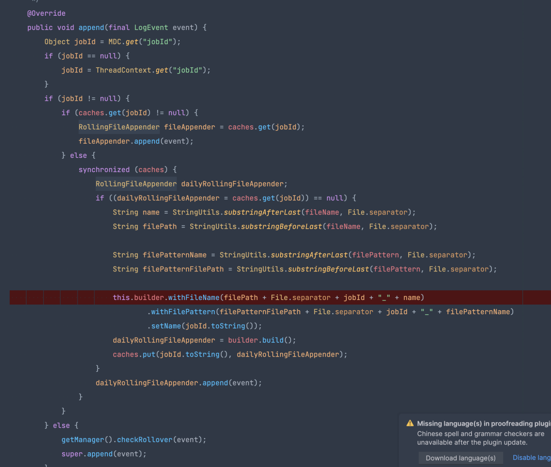 自定义的 appender 可以根据 MDC 里的 jobid 输出到对应的日志文件,因此其扩展逻辑为根据 MDC 里的 jobid 是否为空。如果不为空,则输出到 jobid 对应的文件,否则就是默认的 taskmanager.log。