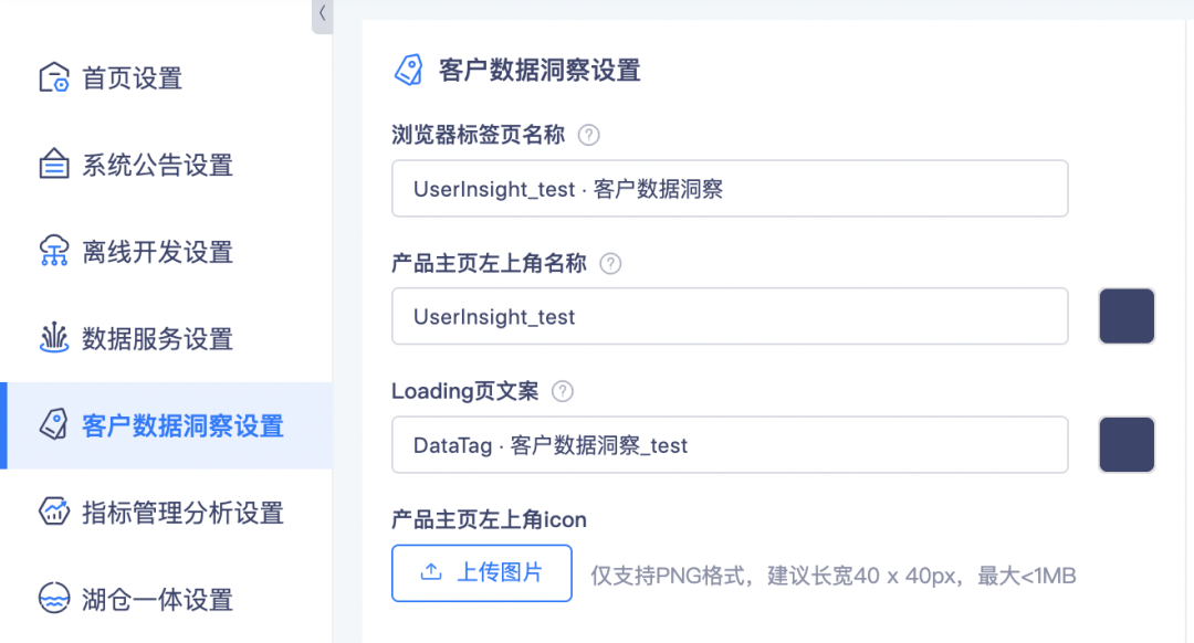 • 通过数栈首页进入「页面配置」界面,更新「客户数据洞察设置」内的配置内容,配置页面见下图: